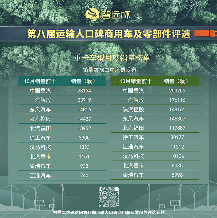 2025年10月中国重汽销售重卡28154辆,市场占有率为26.51%,同比增长70.50%,环比增长0.47%,1-10月累计销售重卡为253255辆。在当月运输人品牌指数榜中,中国重汽关注指数为3976。汕德卡G7、G5S、C9H,以及豪沃TH7、豪沃MAX等车型受到行业关注。